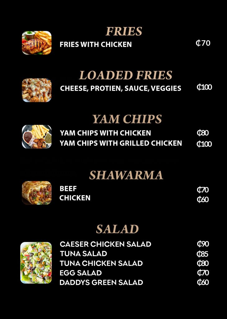 At Daddy’s Pizza, we blend bold flavors, fresh ingredients, and passion to create meals that satisfy every craving. From our perfectly baked crusts to our golden yam chips and hot chicken wings—every bite is made with love.